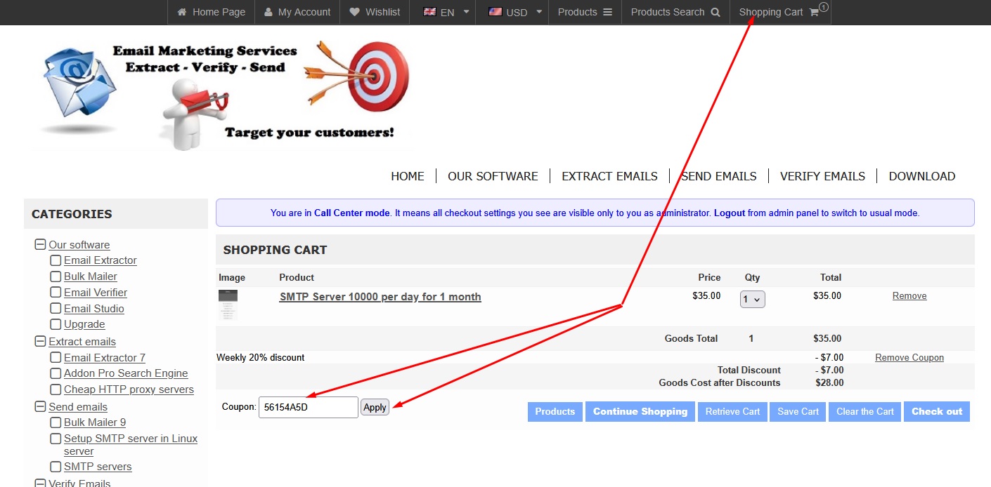 We offer you to buy our Email Extractor, Bulk Mailer, Email Verifier, Addon search engine, SMTP and SOCKS servers with a 20% discount from April 03 to 20. To get a discount apply the coupon Q538B503 in the shopping cart.